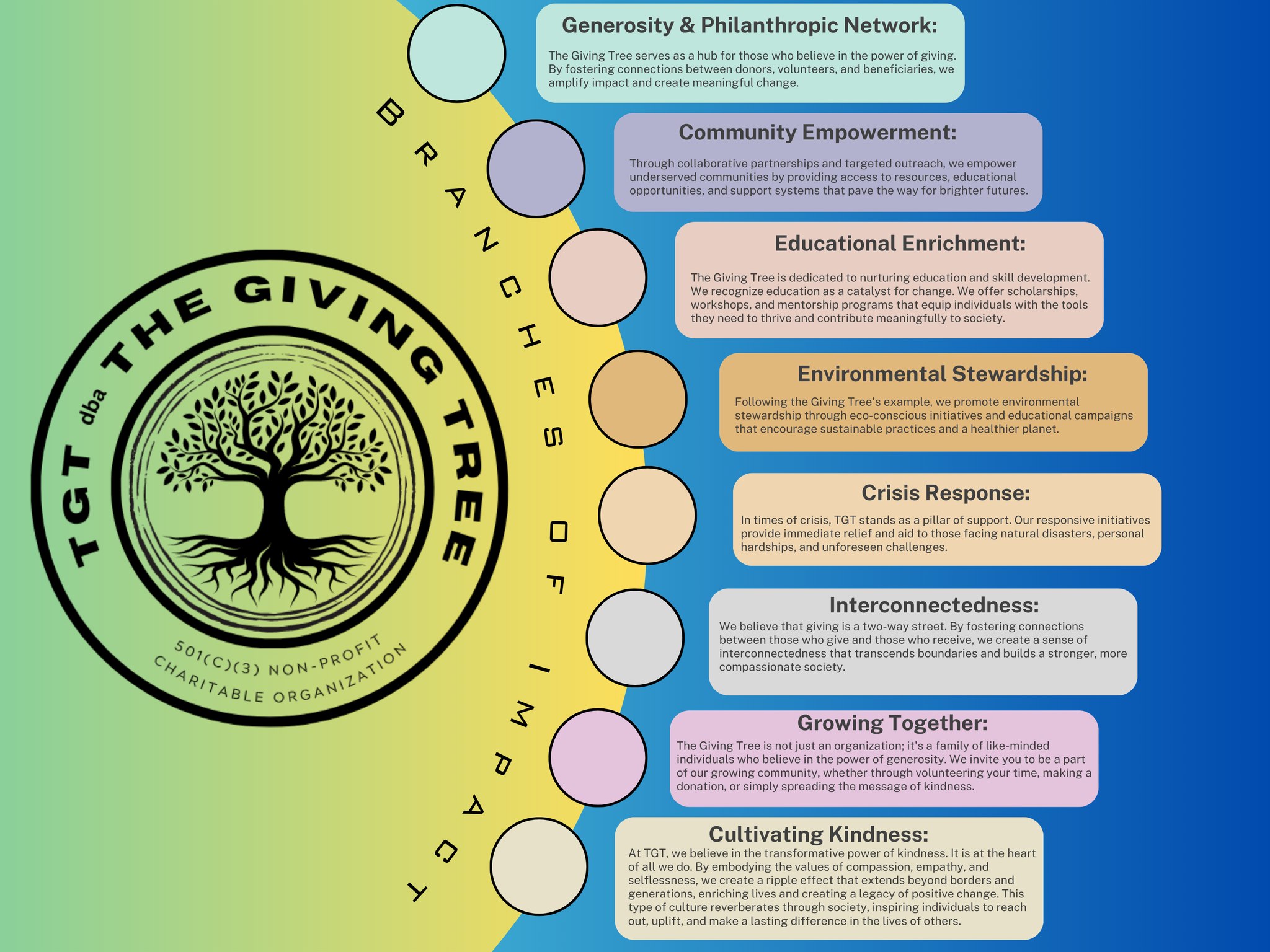 TGT, doing business as The Giving Tree, is a registered 501(c)(3) charitable organization committed to enriching lives. We aim to build a more compassionate world by fostering positive change, empowerment, and community well-being. Guided by the symbolism of the Giving Tree, we are committed to nurturing growth, spreading kindness, and creating a lasting impact in the lives of individuals and communities we serve.